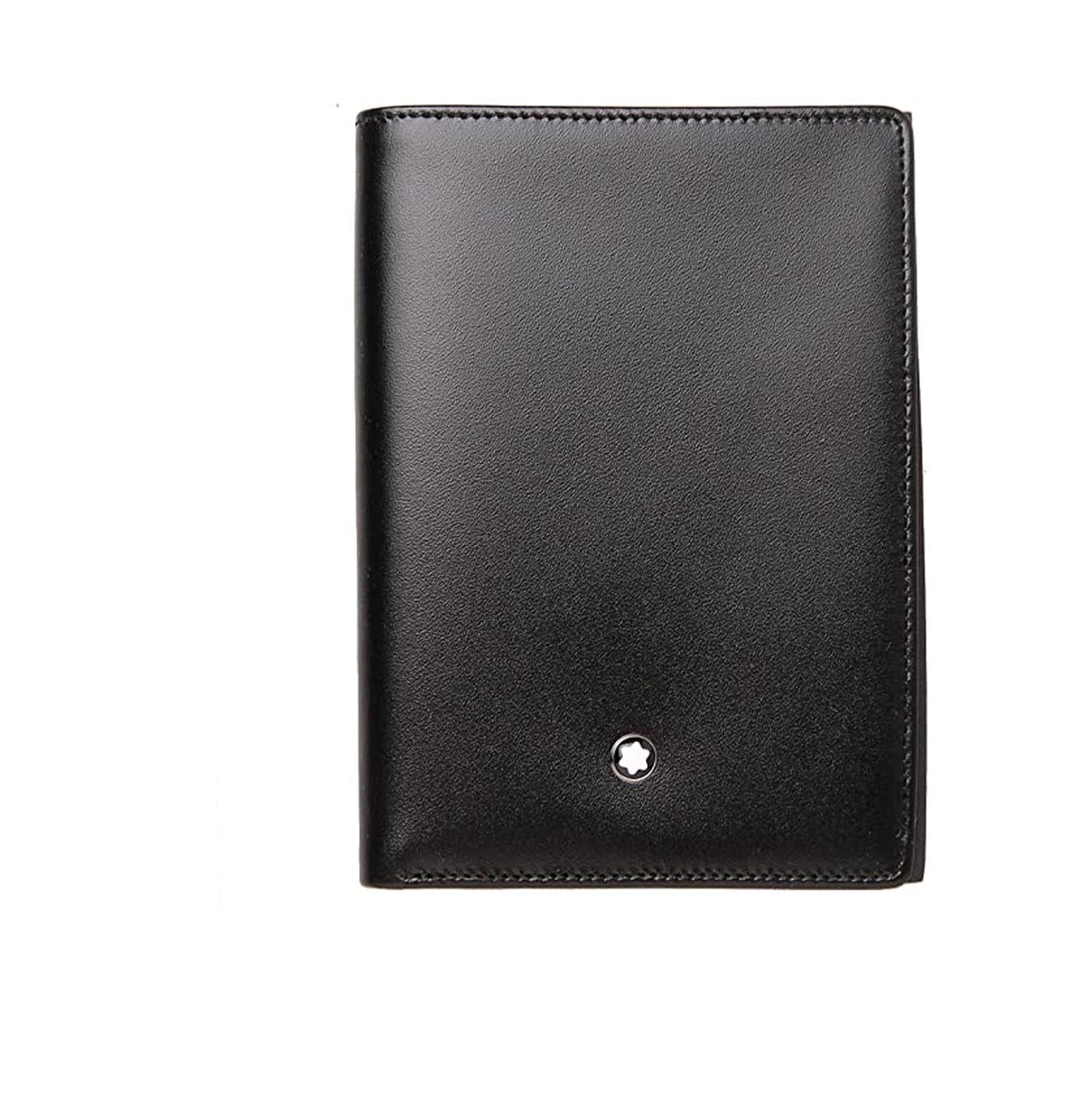 Portafoglio 4 scomparti in pelle di vitello pieno fiore europea, nero lucido esclusivo Montblanc, fodera jacquard con marchio Montblanc, emblema Montblanc con anello finitura palladio, 4 tasche per carte di credito, scomparto per banconote, 4 tasche extra.