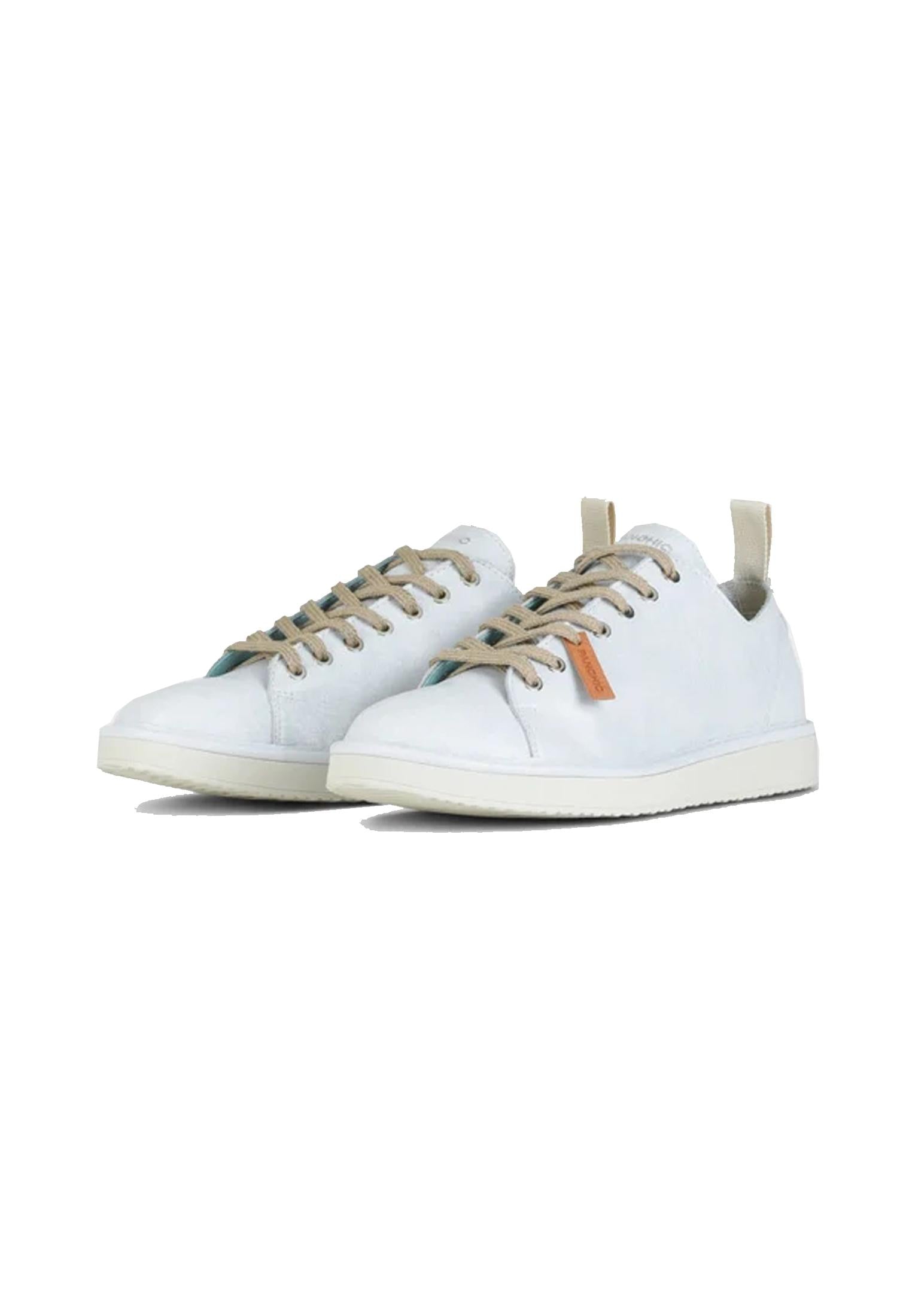 Scarpe allacciate P01 con tomaia in pelle bianca caratterizzata da una rifinitura invecchiata. Questo prodotto viene lavorato parzialmente a mano, la presenza di eventuali difformita' sulla superfice sono un elemento caratteristico dell'articolo che rendono unico e non replicabile ogni paio. Lacci in iuta. La linea P01 rappresenta il perfetto equilibrio fra design e comfort.